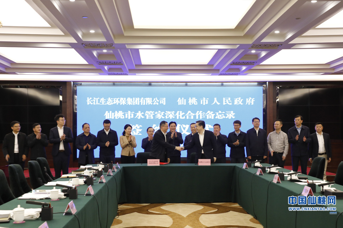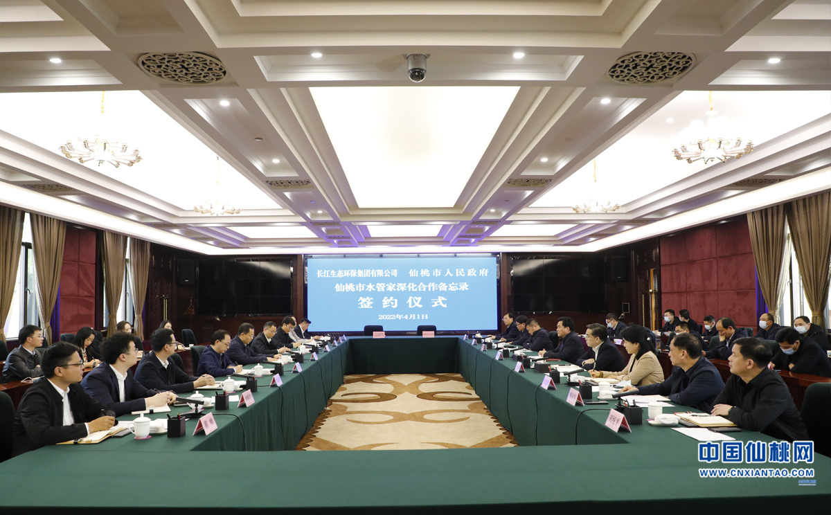 长江环保集团党委书记、董事长王殿常出席签约仪式并讲话。市委书记罗联峰致辞。市长孙道军与长江环保集团副总经理李天智签订《仙桃市“水管家”深化合作备忘录》。市委副书记、政法委书记李少云主持签约仪式。