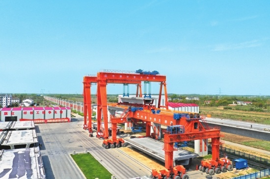 荆荆铁路3标段长18.931公里。其中,荆门市境内线路长4.58公里,经过沙洋县十里铺镇;荆州市川店镇境内14.35公里,全段共有538榀梁架设。截至4月6日,已架设9榀箱梁,整个架梁任务预计到明年初完成。(梅闻冷朝乾李文健摄)