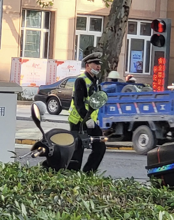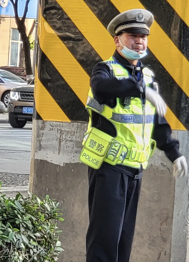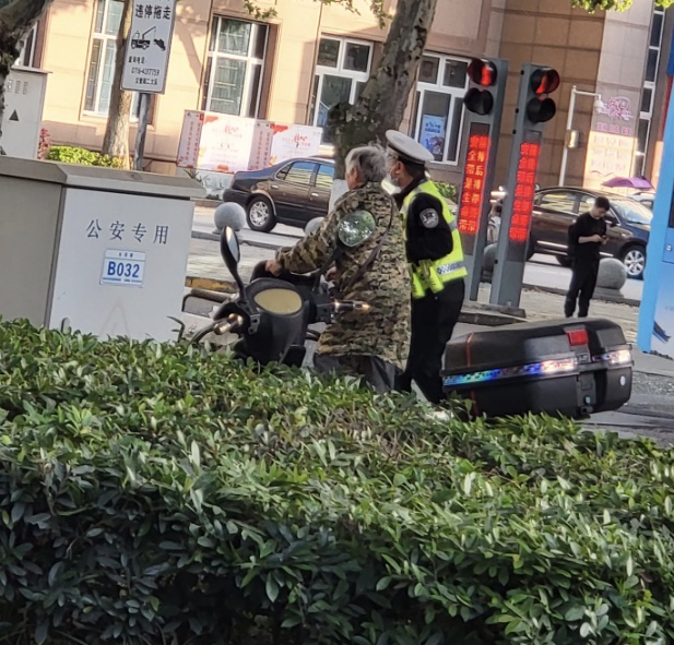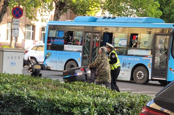 从图片中可以看到,当时交警正在北湖路东边执勤,突然发现西路口站着一位老人,正推着轮椅颤颤巍巍地向前挪动,担心车流影响到老人安全,交警便箭步迎了过去,小心翼翼地搀扶着老人过了两条马路。