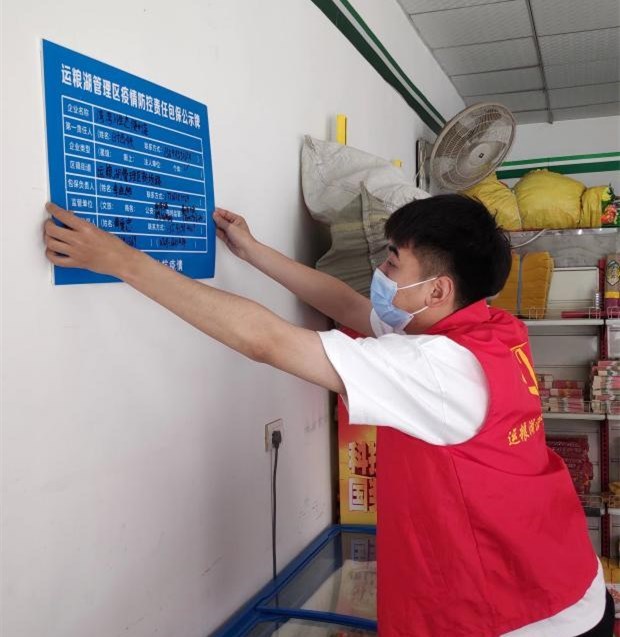 为倡导居民养成健康文明的生活方式,4月12日,管理区组织社区志愿者开展爱国卫生月文明实践志愿服务活动,同时强化疫情防控宣传力度。志愿者在各居民小区及农贸市场等地张贴横幅标语40余条,并在各快递点及超市醒目处张贴“运粮湖管理区疫情防控责任包保公示牌”,呼吁大家从自身做起,养成良好的卫生习惯,爱护身体健康,创建绿色家园,万众一心,共同抗击疫情。