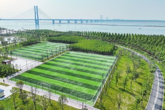 俯瞰今年初完工的临江仙公园二期项目,篮球场、网球场、门球场遍布园内,可满足各年龄层次市民需求。
