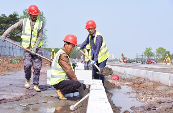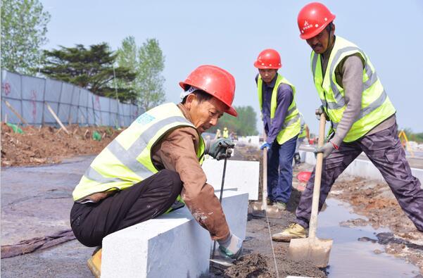 荆江大道御河路至西环路段,两名施工人员正在将路肩石摆放到指定位置,另一名施工人员并用水泥填平周围路面,准备为铺设路肩石做好准备。