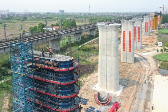 4月15日,在荆荆铁路4标段中铁十二局集团跨江汉运河项目工地,施工人员在高约20米的桥墩上施工。