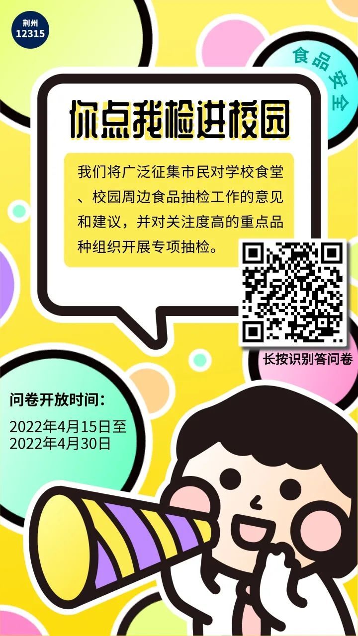 食品安全关系人民群众身体健康和生命安全,涉及千家万户,事关民生福祉。根据食品安全“守底线、查隐患、保安全”专项行动要求,结合年度食品抽检工作计划,荆州市市场监督管理局决定将守护校园食品安全“你点我检”活动作为主题开展活动,通过加强与公众的互动交流,营造食品安全社会共治的良好氛围,切实增强人民群众的获得感、幸福感和安全感。