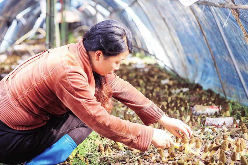 随县高城镇积极引导农民发展食用菌产业,组织成立专业合作社,帮助农民增收。图为农民正采摘羊肚菌。 (随州日报全媒记者孙洪涛、通讯员张玉国摄)