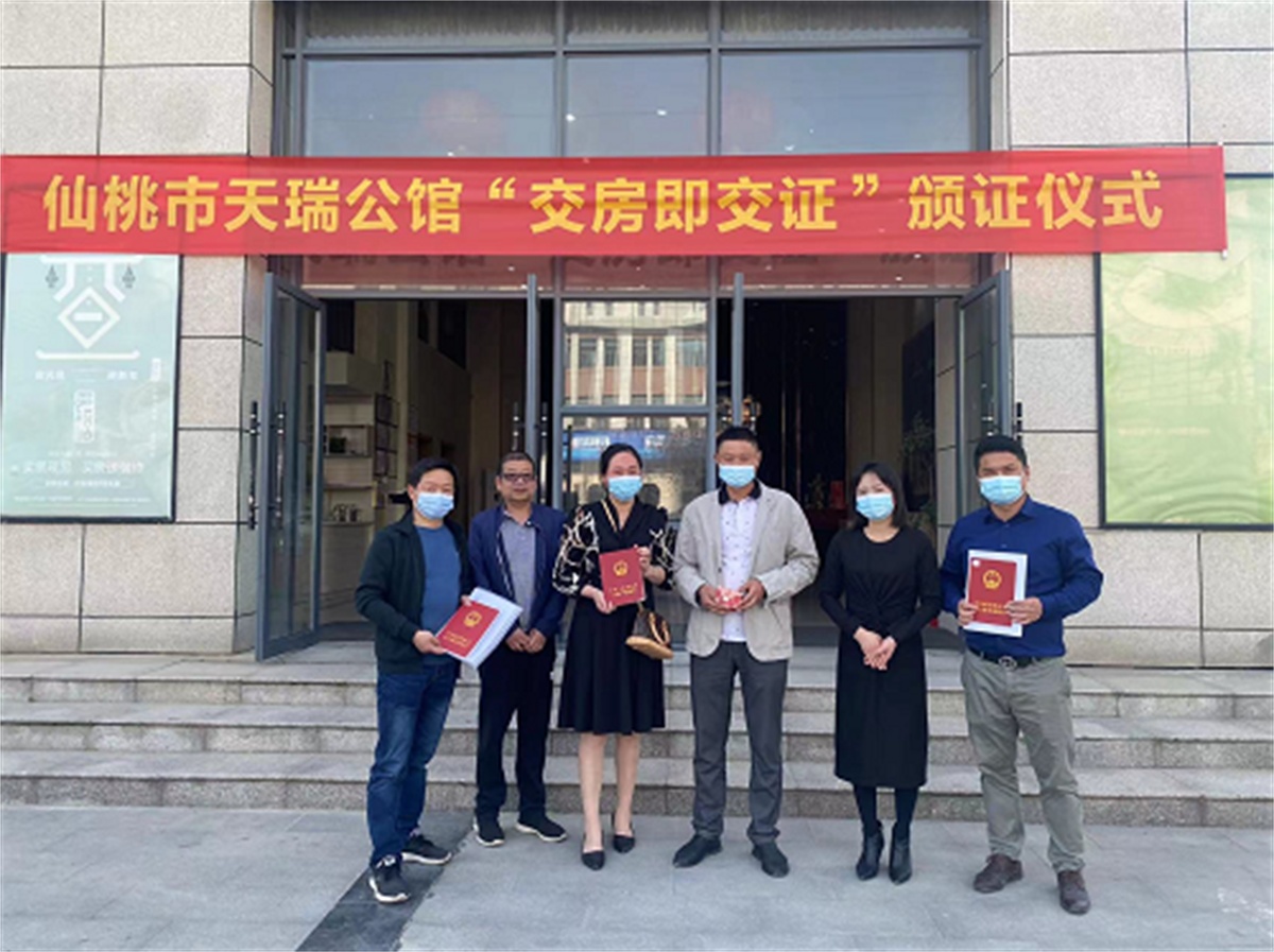 近日,仙桃市天瑞公馆的业主们在交房现场一手持新钥匙,一手捧“红本本”,成为仙桃市“交房即交证”不动产登记服务的首批受益者,标志着仙桃市正式开启“交房即交证”不动产登记服务新模式。