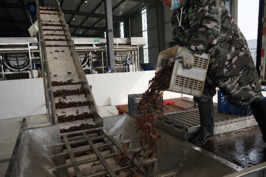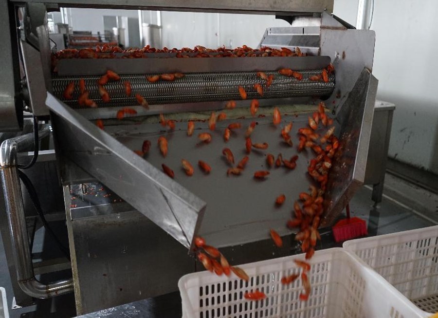 一筐筐活蹦乱跳的小龙虾被倒上传送带,分级、清洗、蒸煮后,由传送带送进加工车间,整个过程实现自动化作业。