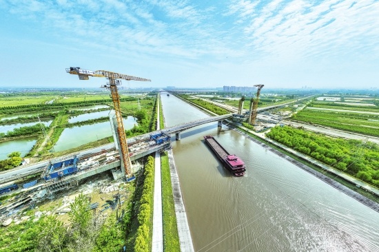 4月18日,无人机俯瞰沿江一级公路跨江汉运河特大桥建设现场,工人们正在进行模板定位,为后续安全施工做准备。