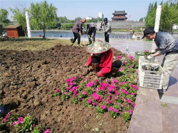 玫红的、紫色的、黄色的……近日,在荆州古城东门外,工人们刚刚栽植的一串红、矮牵牛、孔雀草等鲜花,花色错落有致扮靓着广场、交通岛等区域,为即将到来的“五一”国际劳动节营造出浓浓的节日氛围。