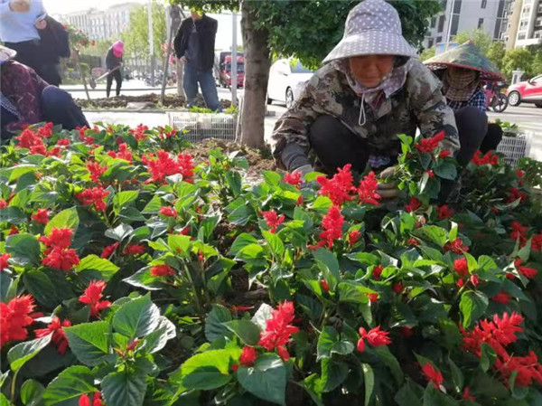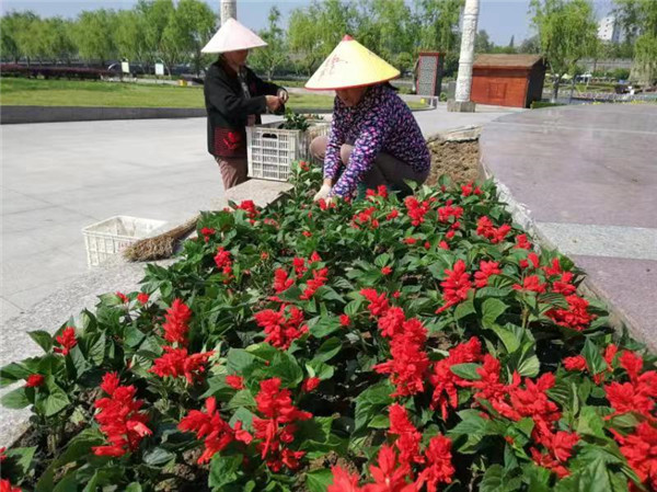 荆州市九龙渊园林绿化有限公司工作人员介绍,为迎接“五一”的到来,公司安排园林绿化工人们在金凤广场、龙舟赛场、草市交通岛、小北门花箱等区域栽植近5.2万株鲜花,这些鲜花有一串红、矮牵牛、孔雀草等,点缀着了街头美景。