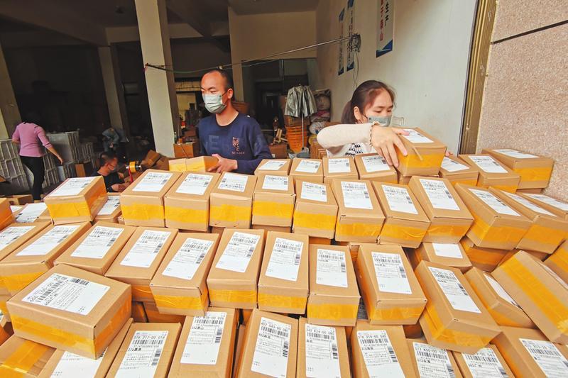 4月20日,随县倍健堂食品有限公司的员工正在按照网上订单打包农产品,准备当天发货。该公司年销售桃胶、油桃、银耳等农产品1000万元以上。 (随州日报全媒记者李文军摄)