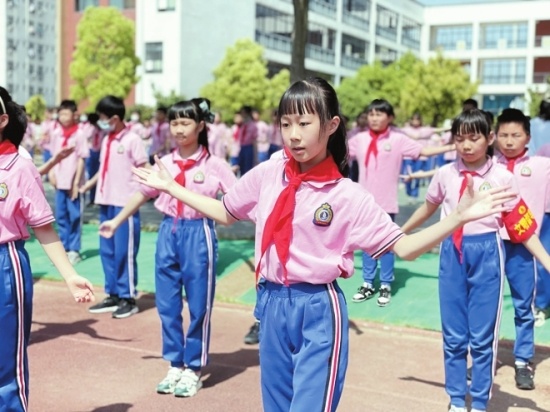 每天上午10时20分下课铃声响起,沙市实小的学生们都会齐聚操场,进行他们最期盼的大课间活动。“一起来,一起向未来……”随着音乐声响起,学生们欢快地挥动着他们的手臂,跳起北京冬奥会主题舞蹈“一起向未来”,尽显实小学子们满满的精气神。“大课间活动不仅缓解了学生们的身心压力,也营造了快乐学习、健康成长的良好氛围。”学校德育主任王瑾说。