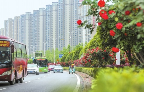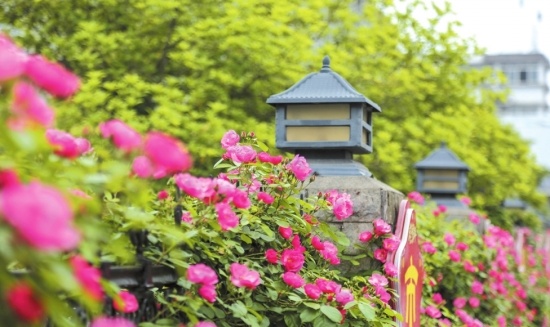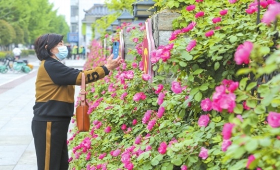 鲜红的树状月季、粉色的藤本月季、黄色的球状月季……近日,5万株月季扮靓中心城区各条道路,芬芳四溢,多处花墙成为市民喜爱的摄影背景墙、网红打卡地。
