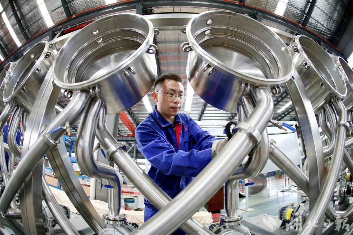 4月15日,湖北山洪食品机械有限公司(荆州)生产车间,员工在装配出口老挝的食品机械。