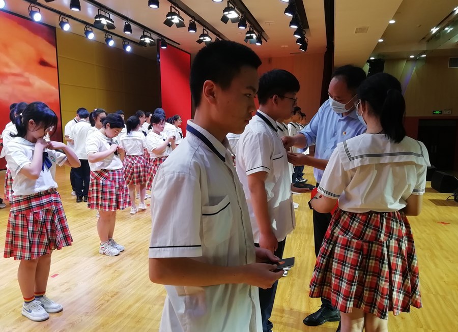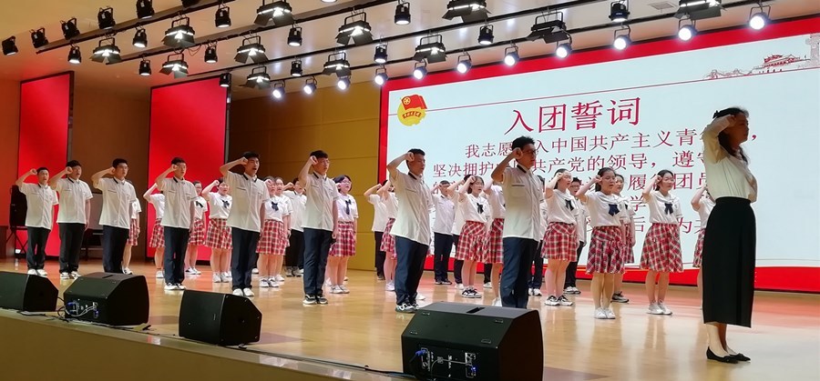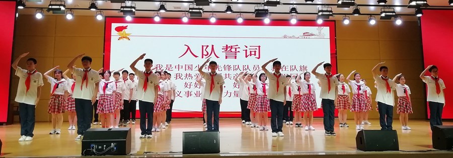 活动在雄壮的国歌声中拉开帷幕。接着,通过出队旗、重温少先队队歌、退队旗等仪式,年满14周岁的少先队员们光荣离队,正式告别金色童年,步入青春年华。该校42名品学兼优的少先队员光荣入团,成为党的助手和后备军,与会领导和老团员为新团员佩戴团徽、颁发团章,新团员高举右拳庄严宣誓正式加入中国共产主义青年团。