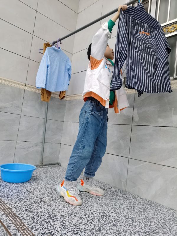 “交换身份的前一天我就想好了,要代替妈妈做很多事情。洗碗、擦桌子、整理沙发、叠衣服、整理衣柜。”经历了一天后,一(3)班杨羽骞同学感受到最难的事是洗衣服。看到一满盆的脏衣服,他甚至有点嫌弃,弄得到处都是泡泡,中途他还丢下脏衣服逃跑了。在妈妈的劝说下,重新回到洗手间。“我的手洗红了,我的袜子还是没有洗干净,我以后再也不穿袜子在地上走了……做家务太不容易了,我一定要好好珍惜家人的劳动成果。”