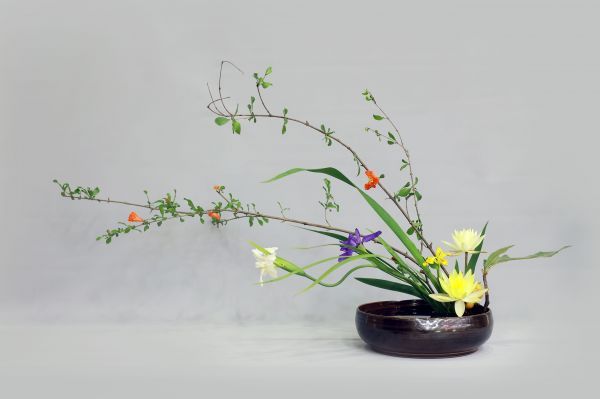 教室正前方是一个长3米、宽2米的大型花艺作品,名为《湖山胜意》。一根根树枝横亘,如同一座座山峰,树枝间摆放着形态、花色各异的朱顶红,仿佛山间百花盛开;作品前部是几个扁平容器,里面插着睡莲、荷叶、鸢尾等水生植物,仿佛一个个雅致的小湖。华中农业大学副教授秦仁强拿出一张如意的照片向记者介绍,站远看,整个山势的起伏正是一个如意的造型,盛开的花朵仿佛如意上雕刻的纹样,正好点了“胜意”之题。