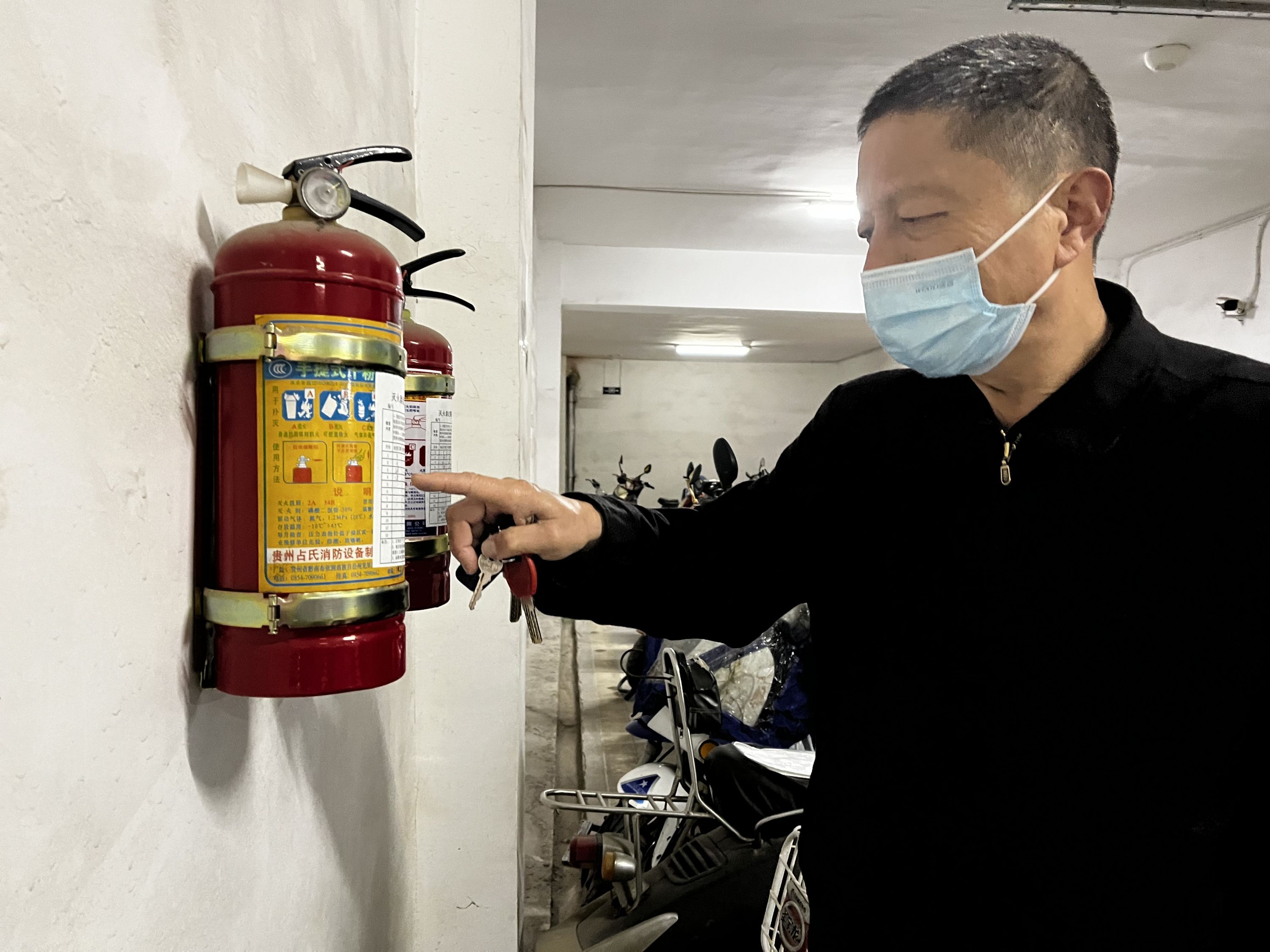 夏望春正在检查车棚的消防设施。长江日报记者秦璟 摄