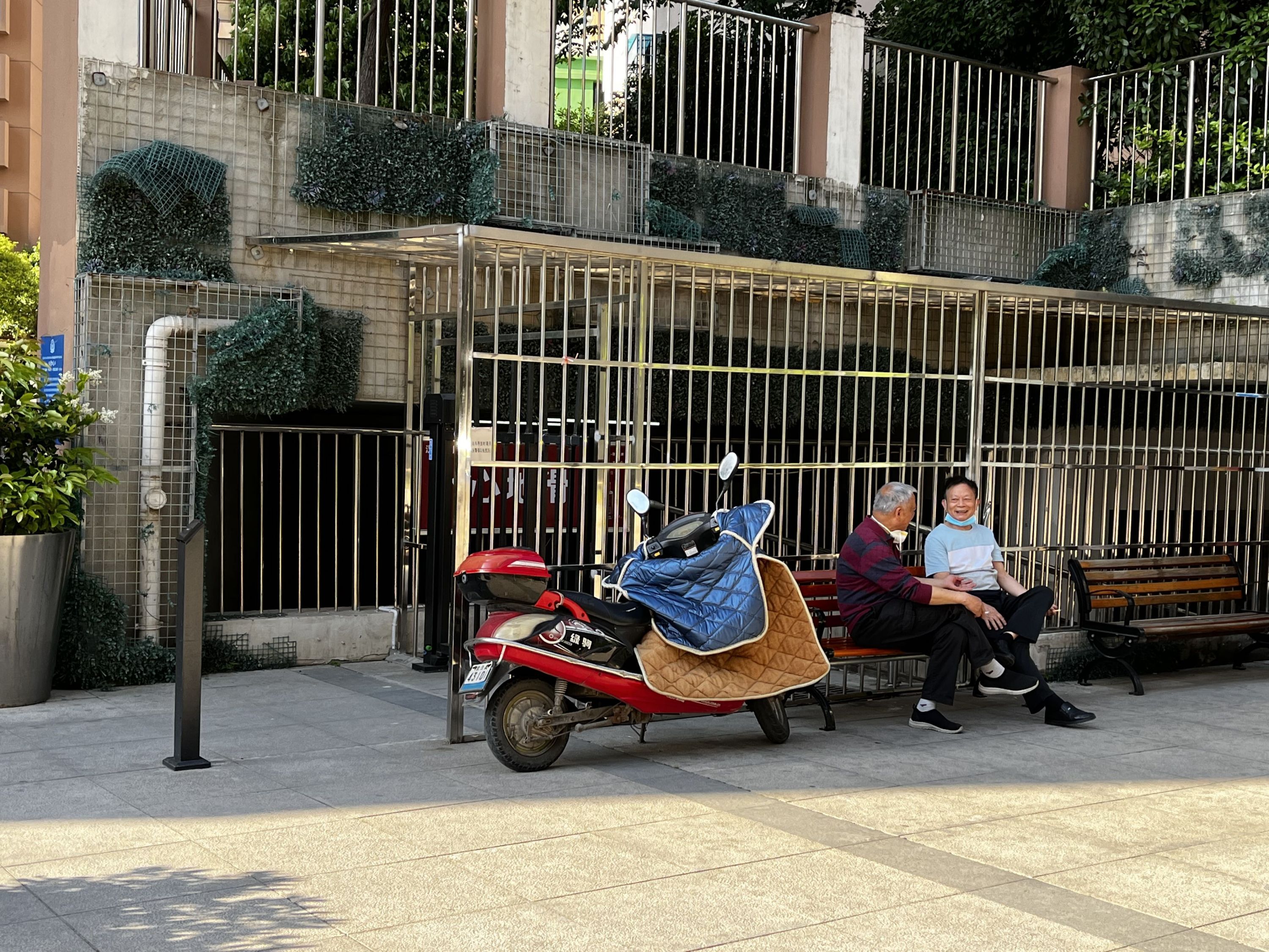 居民们坐在车棚外的长椅上短暂遮阳休息。长江日报记者秦璟 摄