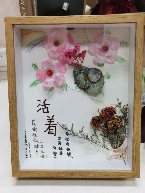 活动视频连线之前,萱萱一家特地手工制作了一个鲜花标本相框,让女儿送给郑松叔叔。萱萱妈妈说:“正是郑松的捐献让萱萱重获新生,也让我们的家庭重新有了笑声!”