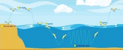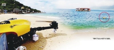 碧海蓝天下,一个黄色机身黑色旋翼“小精灵”腾空而起,飞抵目标海域后快速下降并潜入海水,完成水下观察任务后,又自主上浮,从海面轻盈起飞。