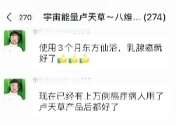 近日,有网友通过武汉城市留言板反映,朋友加入了一个名为“宇宙能量卢天草八维能量爱大丰收”的微信群。这个270多人的群里,群主不断吹嘘所谓卢天草产品的惊人疗效,甚至声称“长期使用产品,能让人返老还童”“已经有上万例癌症病人用了卢天草产品后都好了”……