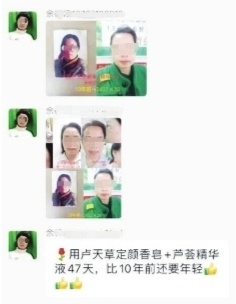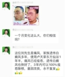 4月24日,记者进入该群。群里,群主被网友们称呼为“余老师”。“余老师”不停在群里滚动发布着一张张对比图、一段段神乎其神的文字描述。还不时有疑似的“托”反馈使用后的效果。记者梳理这些互动交流信息发现,糖尿病、高血压、痛风、乳腺癌、白癜风等疾病都被卢天草产品“治好”了。