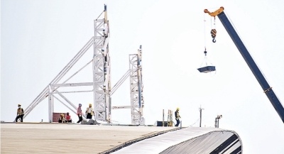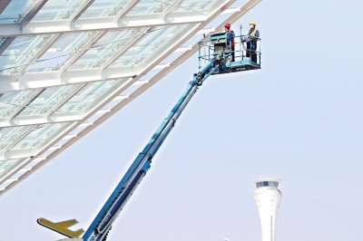 武汉天河机场T2航站楼改造项目现场,工人正在航站楼屋面施工。