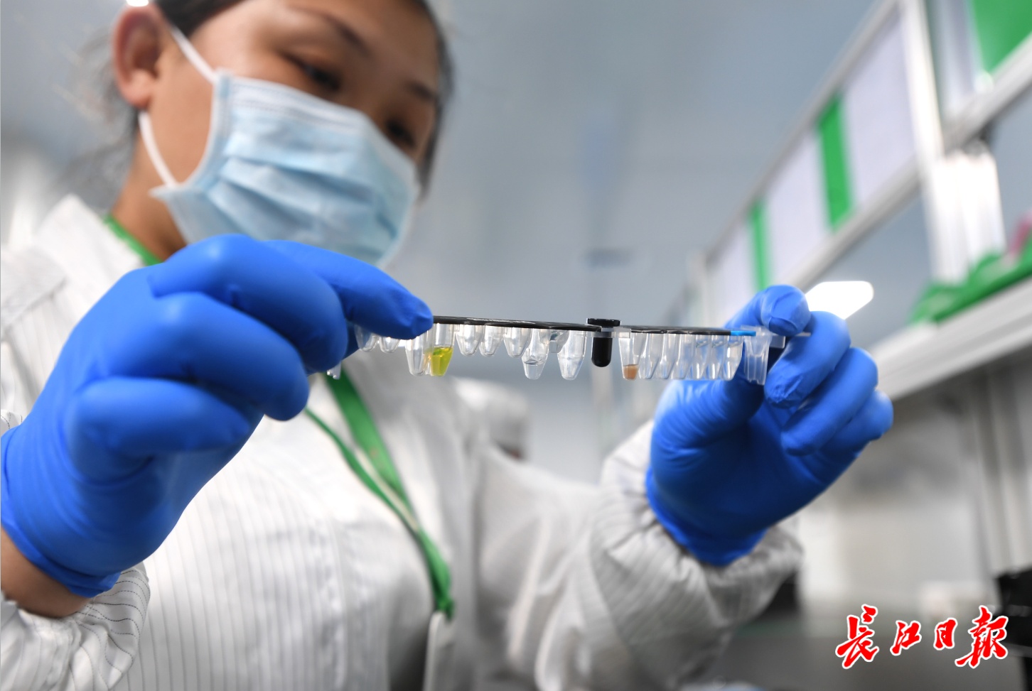 武汉明德生物科技股份有限公司技术人员在聚精会神检查化学发光试剂条外观。记者高勇 摄