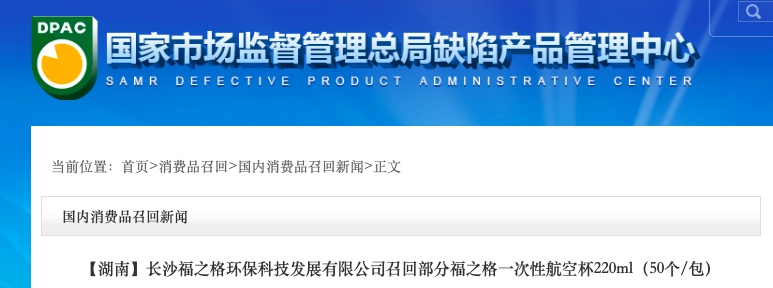 即日起,长沙福之格环保科技发展有限公司召回2020年8月7日至2022年1月18日制造的福之格一次性航空杯220ml(50个/包),涉及数量为24000包;同时,召回2021年1月18日至2022年1月15日制造的福之格超值装纸杯,涉及数量为28000包。