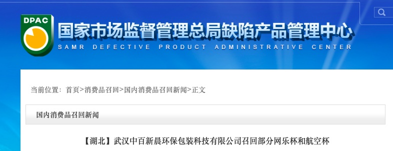 即日起,武汉中百新晨环保包装科技有限公司召回2021年1月31日至2月2日、4月9日至4月11日生产的网乐杯,生产批号分别为20210131和20210409,涉及数量4300包;召回2021年4月3日至4月9日生产的航空杯,生产批号20210403,涉及数量3500包。