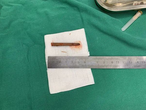 5月3日,泪道/眼鼻相关专科张将主任为熊先生进行了手术。术中发现,熊先生左眼内眼角到泪囊再到鼻腔,竟藏有一截断掉的长约5厘米的木筷,好在眼球、眼部神经和肌肉都没有受到二次损伤。医生为其顺利完成了眶内异物取出术、泪小管吻合术、泪囊裂伤修补术、眼睑裂伤缝合术加鼻泪道再通术。