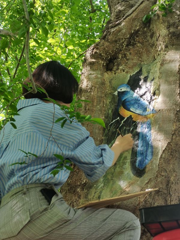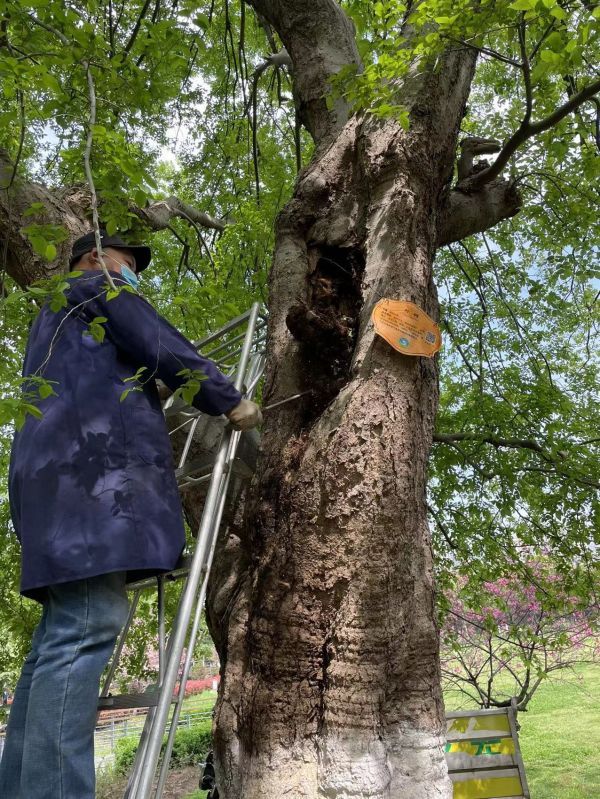 先对树洞内外的腐烂物进行彻底清理,又使用高温喷枪杀死虫卵,并涂抹石灰消毒,随后洞内用钢筋作支架,聚氨酯泡沫胶作填充,使洞内没有空隙,最后用水泥封口并涂上防水腻子。经过一番操作树洞修补完成了,可站在树下一眼就能看到这个大补丁,很不美观。后来大家就商量,是不是能用手绘美化一下。