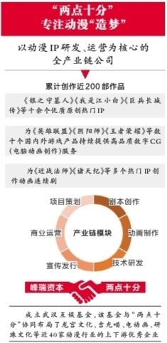 总部位于武汉光谷关山大道的两点十分是一家以动漫IP研发、运营为核心的全产业链公司,也是中国头部动漫企业之一,以“产能稳定”“三渲二技术”及“跨界”三大标签为行业熟知。