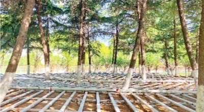 来到公园西北角,这里的活动空间更为丰富。记者看到,在一片高大松树林下,纵横交错地搭建着钢筋龙骨。工作人员介绍,这片区域约500平方米,周边都是树龄20多年的松树。“以前每到早晨,许多市民来此晨练、打太极拳,所以我们在改造中专门对此处进行了升级,后续将铺上防腐木地板,市民锻炼不用担心踩一脚泥土。”