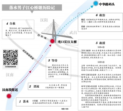漂至沌口长江大桥下,他紧紧抓住桥墩,幸运地爬了上去,可身上衣服财物已被江水冲走,他也曾想过从桥墩上游回岸边,无奈体力不支,只好在桥墩上等待,等了4天,终于等到民警前来救助。