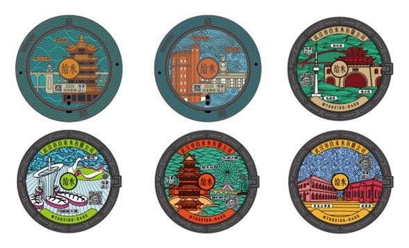 “汉水的城市徽章”系列井盖是由武汉市水务集团与武汉大学师生共同设计,汉水科技公司铸造出品,该系列井盖的设计理念专注提炼汉派文化元素,为武汉高质量发展的道路上佩戴“城市徽章”,通过编制“武汉文创系列井盖”系统,将百年武水的企业文化与武汉三镇、两江四岸独特的地理条件、地标建筑和历史人文相融合。按城市地标类、重点保障类、红色印记类设计制作系列文化井盖,长江大桥、黄鹤楼、江汉关、汉口水塔、晴川阁、龟山电视塔等地标成为最显著的元素。