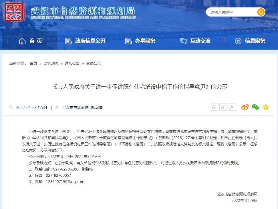 武汉市自然资源和规划局发布《市人民政府关于进一步促进既有住宅增设电梯工作的指导意见》的公示(以下简称《意见》)。《意见》指出,为进一步完善既有住宅增设电梯政策机制,适应老龄化社会需求,提升城市生活品质,加快增设电梯速度。
