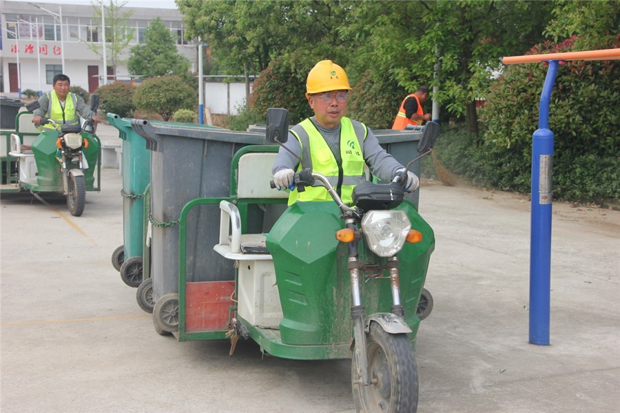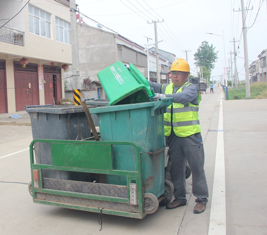 5月5日上午,记者走进积玉口镇荷花村看到,垃圾清运员正将村民门前的生活垃圾收集、转运至垃圾中转站。