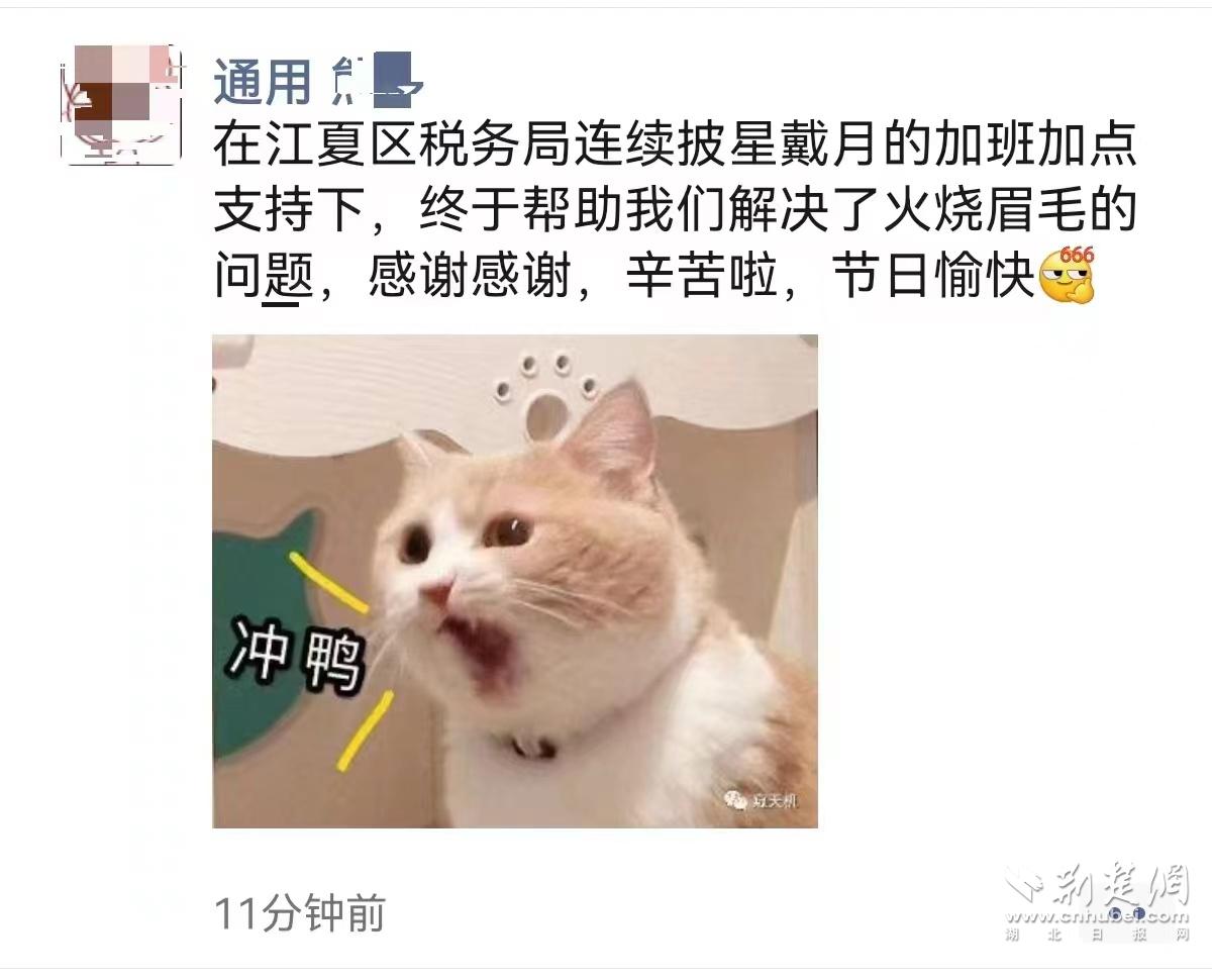 荆楚网(湖北日报网)(通讯员胡梦婷、严娉)近日,上汽通用汽车有限公司武汉分公司(以下简称“武汉分公司”)财务人员熊先生发布了一条朋友圈,感谢税务人员“披星戴月”为他们解决了“火烧眉毛”的难题。