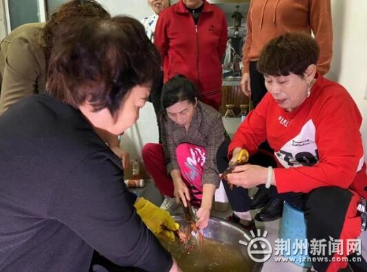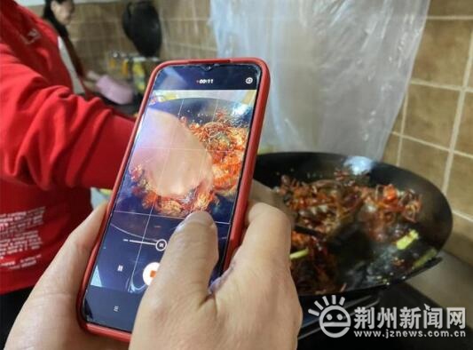 上午10点,荆州区菱角湖管理区楚源社区广场舞蹈队的多名队员来到一家餐馆,他们带来的拿手菜是油焖大虾。舞蹈队队员们手脚麻利,一大盆小龙虾很快被清理干净,记者注意到其中一名舞蹈队队员并没有参与做菜,而是拿着手机记录过程。烧油、放佐料、翻炒、慢炖,半个小时后,色香味俱全的油焖大虾做好了,伙伴们立即围过来尝鲜。这开心的一幕幕也被兰姨妈用手机记录了下来。