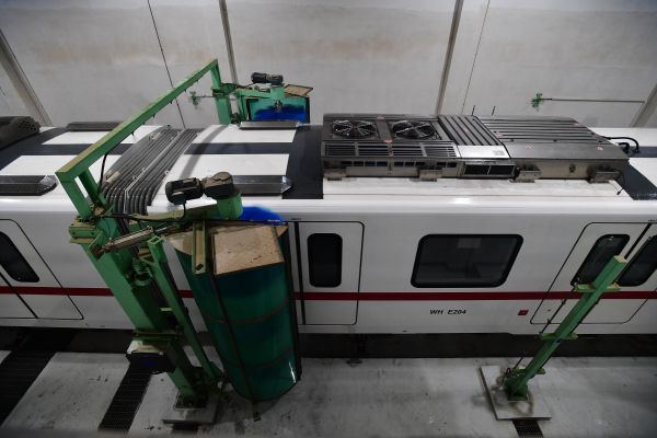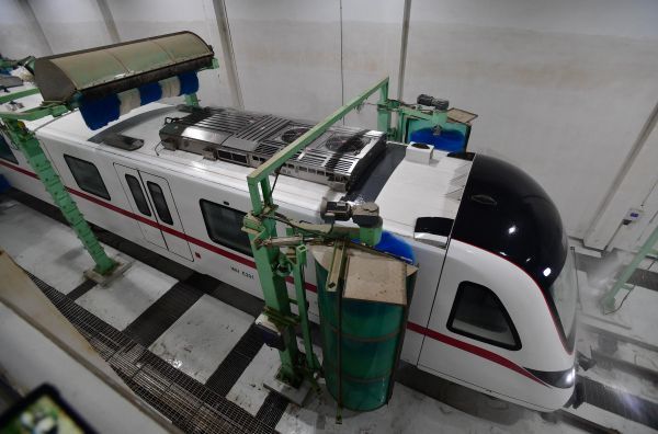 洗车过程中,列车速度放缓至3公里/小时,“边走边洗”,整个过程用时5分钟,“洗澡”完毕的列车还可以自己换轨回库。