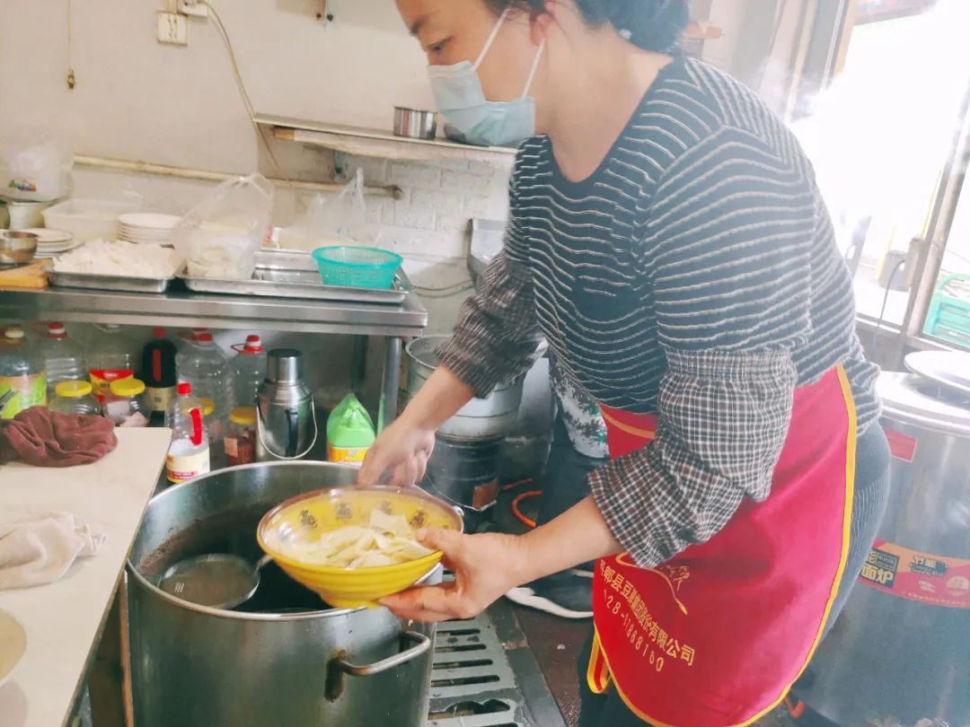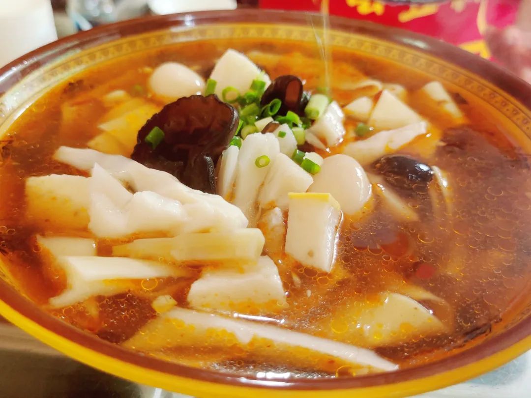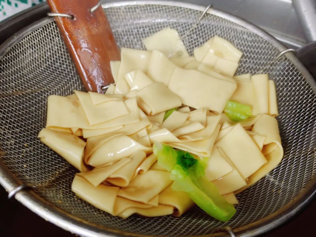 水煮得滚开后,把块子像散花般撒进去,煮个三分钟起锅。块子的口感比起一般的面条更加劲道,但需要趁热拌开,以免粘连影响口感。