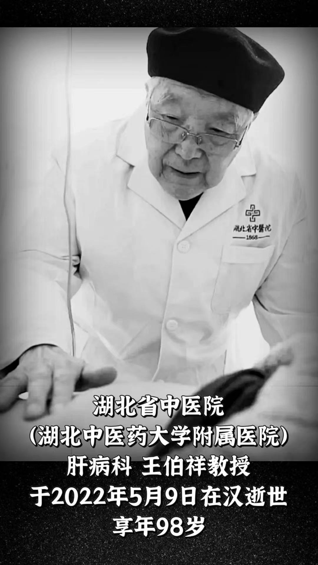 昨日,湖北省中医院发布讣告:全国名中医、湖北中医大师、全国名老中医药专家、国家中医药管理局第一批名老中医药学术继承师承导师——湖北省中医院(湖北中医药大学附属医院)肝病科王伯祥教授,于2022年5月9日在汉逝世,享年98岁。