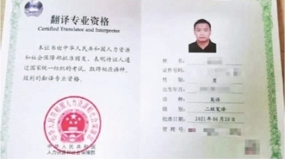 在北二外读书期间,他还通过了全国翻译专业资格考试(CATTI),是首位参加这项考试的盲人考生。2021年6月20日,他参加二级笔译考试,9月份拿到翻译资格证书。他在前后沟通的过程中了解到,他极有可能也是第一个参加CATTI二级笔译考试并拿到证书的全盲考生。