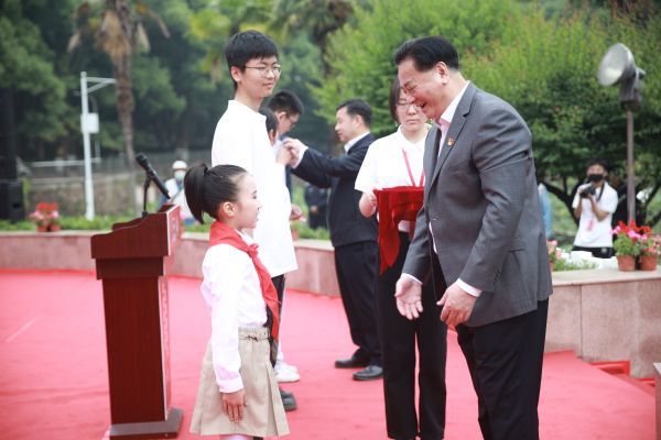 校党委书记李元元为少先队员、共青团员、青年党员代表佩戴红领巾、团徽、党徽。
