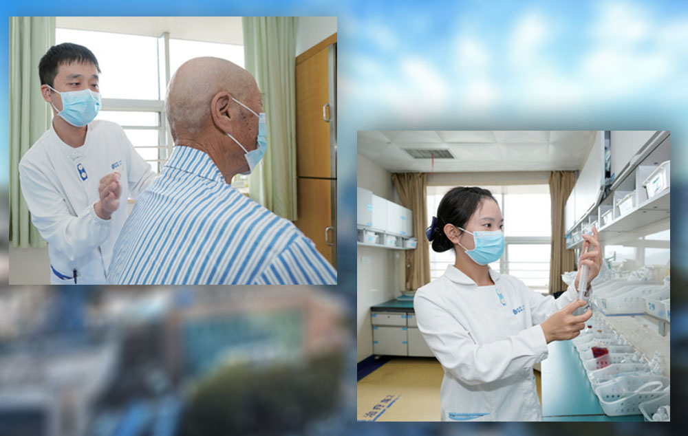 左为呼吸与微重症科室护士刘哲为患者扣背排痰。右为消化内科护士杨晓璐在配药室抽药配药。