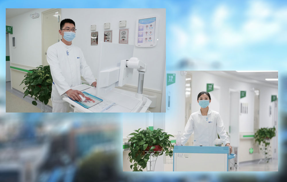 左为神经内科护士简国武整理登记患者信息。右为消化内科护士张娟推送治疗车准备为患者打针。