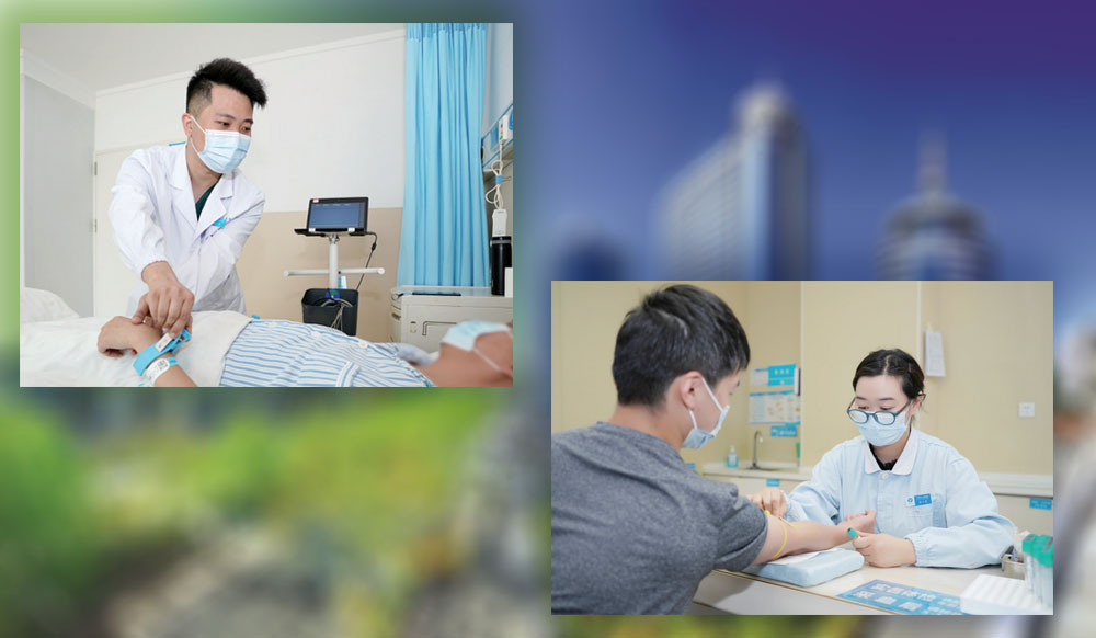 左图为刘涛给患者做心电图。右图为杨小溪为体检人员抽血。