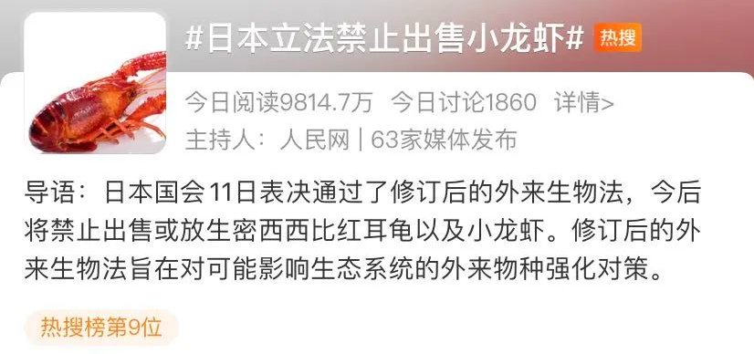 据央视财经,日本国会11日表决通过了修订后的外来生物法,今后将禁止出售或放生密西西比红耳龟以及小龙虾。修订后的外来生物法旨在对可能影响生态系统的外来物种强化对策。